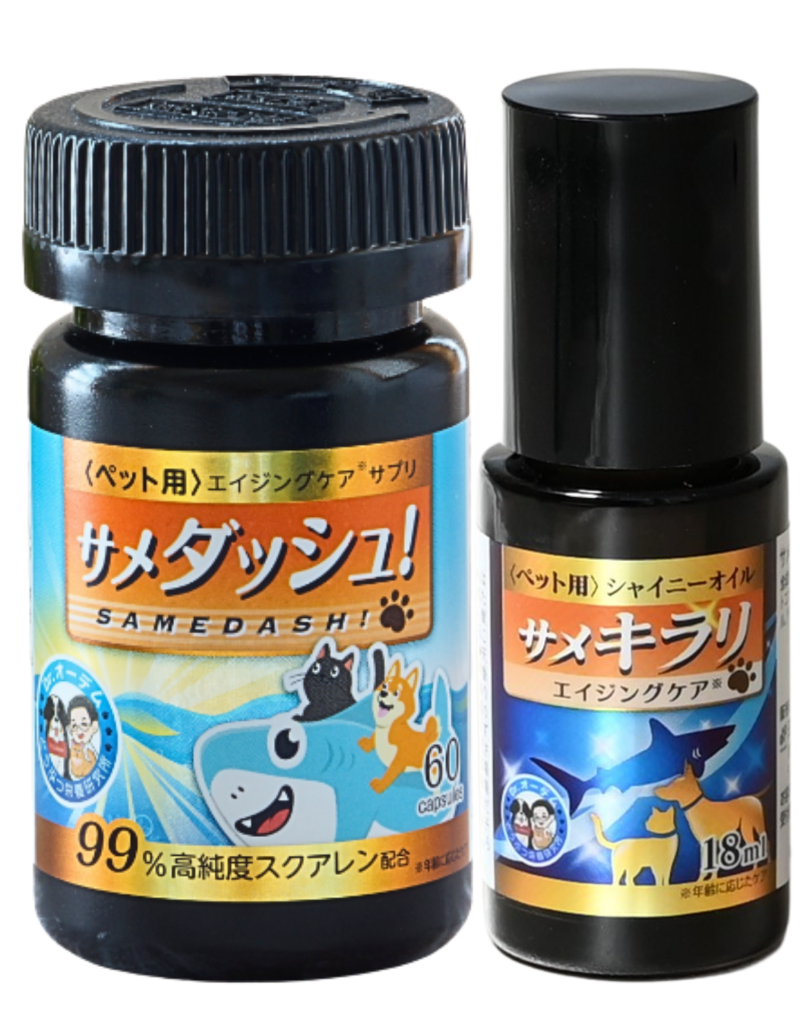エイジングケアサプリメント「サメダッシュ!」とペット用シャイニーオイル「サメキラリ」に配合されているスクアレンは、体に欠かせない“うるおい成分”。古くから元気の源として親しまれてきた成分「スクアレン」は、年齢とともに減少するため、日々補うことが大切です。