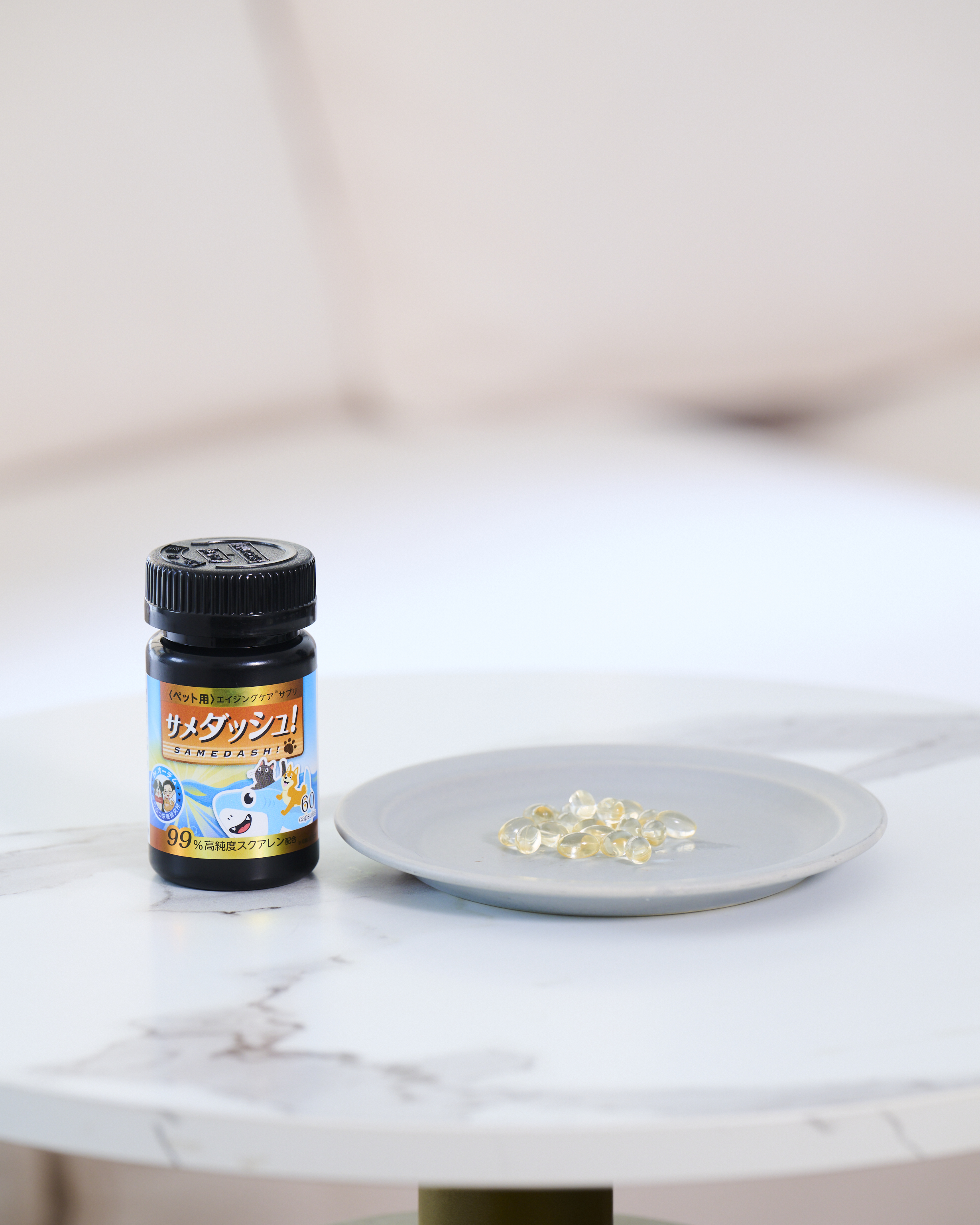 「サメダッシュ!」は、スクアレンを内臓・関節・筋肉など体の内側へチャージし、毎日の元気を応援。ご飯やおやつにプラスするだけで簡単にエイジングケアが続けられます。