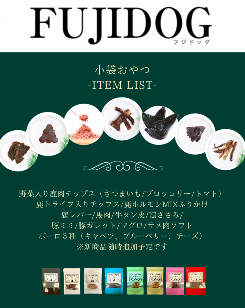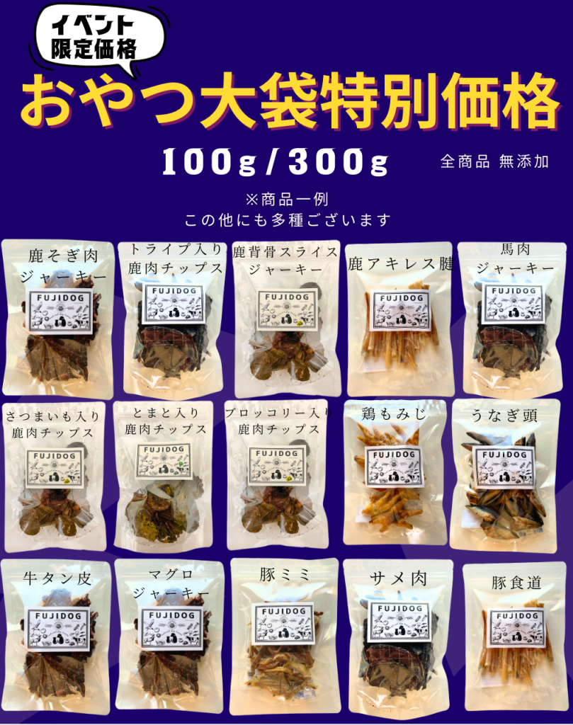 『愛犬といつまでも健康で笑顔に』 国産の新鮮な鹿肉とお野菜を使ったFUJIDOGオリジナルの無添加野菜入り鹿肉チップスは、体に優しいおやつとして大変好評をいただいております。 イベント販売限定で犬用無添加小袋おやつは買い物袋付き3袋1300円、6袋2600円、9袋3800円で販売。 オフ会やプレゼントにおすすめです。 また、大袋のおやつは100g〜大特価で販売! イベント当日の決済方法 現金、PayPay、楽天Pay、d払い、クレジットカード