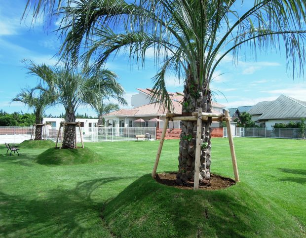 当館に併設の天然芝ドッグランは、およそ300坪の大満足の広さ。