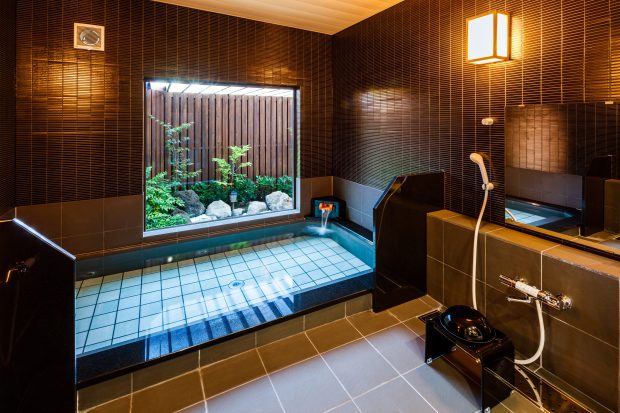 日本の伝統色をモチーフにした、和やかな木欄と艶やかな藍墨をモチーフにした貸切風呂で、ゆったり足をのばしてリフレッシュ。